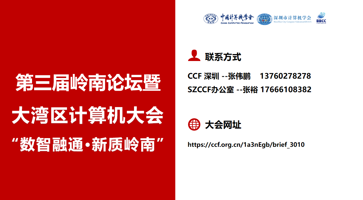 作为面向粤港澳大湾区国家战略的重要学术交流平台,第三届岭南论坛暨大湾区计算机大会由中国计算机学会(CCF)主办,CCF 深圳、深圳市计算机学会(SZCCF)承办,IEEE 广州、ACM 广州、十余城 CCF 分部及 BBCC 湾区同盟等单位协办。大会聚焦具身智能、大模型赋能与量子科技三大前沿方向,响应二十届四中全会 “协同融通发展” 理念,旨在构建国际化、专业化的产学研创协同融通生态平台,推动技术规则衔接与全球创新资源链接,助力大湾区成为全球数字科技策源地与产业创新枢纽。