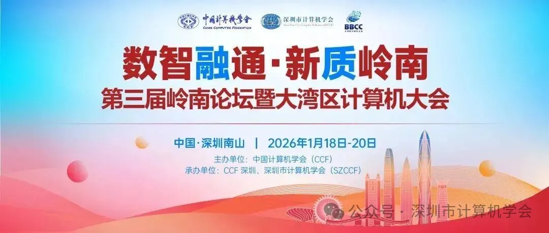 由中国计算机学会(CCF)主办,CCF深圳及深圳市计算机学会(SZCCF)承办的“第三届岭南论坛暨大湾区计算机大会”即将启幕,本届大会响应二十届四中全会“协同融通发展” 理念,面向粤港澳大湾区国家战略,聚焦具身智能、大模型赋能与量子科技三大前沿方向,以市场、资本、技术、信息、人才互通共享为基础,旨在构建国际化、专业化的产学研创协同融通生态平台,助力大湾区打造全球数字科技策源地与产业创新枢纽。